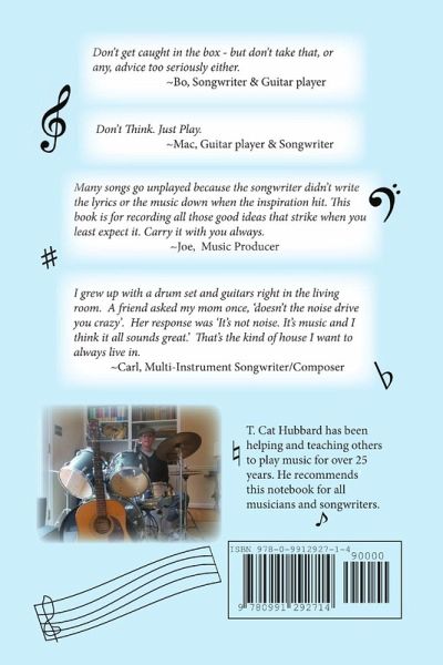 Every songwriter and musician needs a dedicated notebook to carry along to record those fleeting original tunes and lyrics when they appear. Designed by musicians, the Songwriter's Notebook is it. Providing staff and tab outline to jot down inspired music you "hear" during the day as well as lined pages to record and polish your own lyrics, this will soon be a "can't do without." With a convenient size and an attractive cover, this book can be carried anywhere you go. And with inspirational quotes and practical layout for recording your music notes, it is all you need. A great gift for yourself or any musician. Inspirational quotes and 95 pages to record your own creative ideas. Take it to the beach, on a road trip, wherever you go. Don't leave home without it!