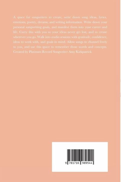 An open concept journal for songwriters to write, create, manifest goals, and take note of songwriting information and studio sessions. Created by Platinum Record Songwriter Amy Kirkpatrick.