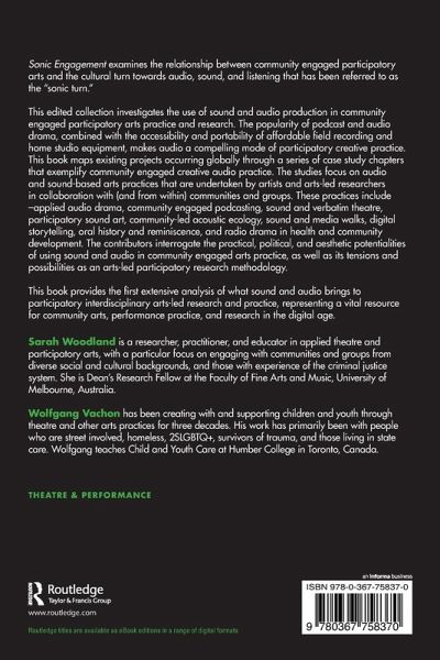 This edited collection investigates the use of sound and audio production in community engaged participatory arts practice and research. The popularity of podcast and audio drama, combined with the accessibility and portability of affordable field recording and home studio equipment, makes audio a compelling mode of participatory creative practice. This book maps existing projects occurring globally through a series of case study chapters that exemplify community engaged creative audio practice. The studies focus on audio and sound-based arts practices that are undertaken by artists and arts-led researchers in collaboration with (and from within) communities and groups. These practices include-applied audio drama, community engaged podcasting, sound and verbatim theatre, participatory sound art, community-led acoustic ecology, sound and media walks, digital storytelling, oral history and reminiscence, and radio drama in health and community development. The contributors interrogate the practical, political, and aesthetic potentialities of using sound and audio in community engaged arts practice, as well as its tensions and possibilities as an arts-led participatory research methodology.