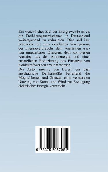 Ein wesentliches Ziel der Energiewende ist es, die Treibhausgasemissionen in Deutschland weitestgehend zu reduzieren. Dies soll insbesondere mit einer deutlichen Verringerung des Energieverbrauchs, dem verstärkten Ausbau erneuerbarer Energien, dem kompletten Ausstieg aus der Atomenergie und einer Reduzierung des Einsatzes von Kohlekraftwerken erreicht werden. Der Autor möchte den Lesern ein paar anschauliche Denkanstöße betreffend die Möglichkeiten und Grenzen einer verstärkten Nutzung von Sonne und Wind zur Erzeugung elektrischer Energie vermitteln.
