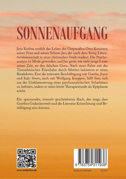 Jens Korbus erzählt das Leben des Ostpreußen Otto Koniezny, seiner Frau und seines Sohnes Jan, der nach dem Krieg Kulturwissenschaft in einer rheinischen Stadt studiert. Die Psychoanalyse ist Mode geworden, und Jan gerät, wie viele junge Leute seiner Zeit, an den falschen Guru. Nach einer Fahrt mit der Transsibirischen Eisenbahn durch Sibirien bekommt er einen Breakdown. Erst die intensive Beschäftigung mit Goethe, Joyce und Italo Svevo, auch mit Wolfgang Koeppen, hilft ihm, sich aus der Umklammerung eines psychoanalytischen Scharlatans zu befreien, indem er seine letzte Therapiestunde als Epiphanie erlebt. Ein spannendes, intensiv geschriebenes Buch, das zeigt, dass Goethes Gedankenwelt und die Literatur Krisenlösung und Bewältigung sein können.