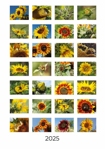Sonnenblumen mit ihren leuchtenden Farben und faszinierender Geometrie ziehen nicht nur die Blicke der Vorübergehenden auf sich, sondern sind eine Nahrungsquelle für viele Insekten und Vögel. Der Lebenszyklus von der Knospe, über die ersten zarten Blütenblätter bis hin zur leuchtenden Blüte und den nicht nur bei Vögeln beliebten Sonnenblumenkernen - ein Wunder der Natur. Sonnenblumen strahlen Zuversicht aus, von eigener und überwältigender Schönheit in jeder Phase ihres Lebens. Tages- und Wochenplaner oder Tagebuch: Jede Woche ein Foto aus der Vielfalt an Sonnenblumen, Kalenderseiten pro Woche, Jahresüberblick 2025, Vorschau 2026, Raum für Kontakte, Erinnerungen und besondere Momente.