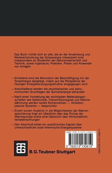 1 Energiebedarf, Energieversorgung und Prognosen für die zukünftige Rolle der Solarenergie.- 2 Sonnenenergieangebot.- 3 Meßmethoden und Meßdaten.- 4 Grundlagen der Strahlungsphysik.- 5 Konzentration und Selektivität.- 6 Wärmeübertragung.- 7 Transparente Wärmedämmung.- 8 Thermische Flachkollektoren.- 9 Passive Sonnenenergienutzung.- 10 Speicherung thermischer Energie.- 11 Wärmepumpen.- 12 Wirtschaftlichkeit von Solaranlagen.- 13 Einsatz solarer Systeme in der Praxis.- 14 Transparent wärmegedämmte Gebäudefassaden.- Verwendete Symbole.- Konstanten.