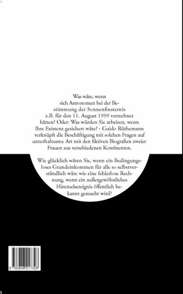 Was wäre, wenn sich Astronomen bei der Bestimmung der Sonnenfinsternis, z.B. für den 11. August 1999, verrechnet hätten? Oder: Was würden Sie arbeiten, wenn Ihre Existenz gesichert wäre? - Guido Rüthemann verknüpft die Beschäftigung mit solchen Fragen auf unterhaltsame Art mit den fiktiven Biografien zweier Frauen aus verschiedenen Kontinenten.Wie glücklich wären Sie, wenn ein Bedingungsloses Grundeinkommen für alle so selbstverständlich wäre wie eine fehlerlose Rechnung, wenn ein außergewöhnliches Himmelsereignis öffentlich bekannt gemacht wird?Zum vorliegenden Buch meinte Johannes Kaup, Radiojournalist beim Kultursender Ö1: »Rüthemann ist ein prosaischer Verpackungskünstler des Utopischen. Der Roman öffnet Horizonte des Denkens einer Gesellschaft, die uns heute unvorstellbar scheint [...]«