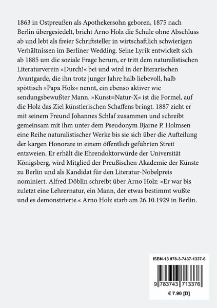 1863 in Ostpreußen als Apothekersohn geboren, 1875 nach Berlin übergesiedelt, bricht Arno Holz die Schule ohne Abschluss ab und lebt als freier Schriftsteller in wirtschaftlich schwierigen Verhältnissen im Berliner Wedding. Seine Lyrik entwickelt sich ab 1885 um die soziale Frage herum, er tritt dem naturalistischen Literaturverein "Durch!" bei und wird in der literarischen Avantgarde, die ihn trotz junger Jahre halb liebevoll, halb spöttisch "Papa Holz" nennt, ein ebenso aktiver wie sendungsbewußter Mann. "Kunst=Natur-X" ist die Formel, auf die Holz das Ziel künstlerischen Schaffens bringt. 1887 zieht er mit seinem Freund Johannes Schlaf zusammen und schreibt gemeinsam mit ihm unter dem Pseudonym Bjarne P. Holmsen eine Reihe naturalistischer Werke bis sie sich über die Aufteilung der kargen Honorare in einem öffentlich geführten Streit entzweien. Er erhält die Ehrendoktorwürde der Universität Königsberg, wird Mitglied der Preußischen Akademie der Künste zu Berlin und als Kandidat für den Literatur-Nobelpreis nominiert. Alfred Döblin schreibt über Arno Holz: "Er war bis zuletzt eine Lehrernatur, ein Mann, der etwas bestimmt wußte und es demonstrierte." Arno Holz starb am 26.10.1929 in Berlin.