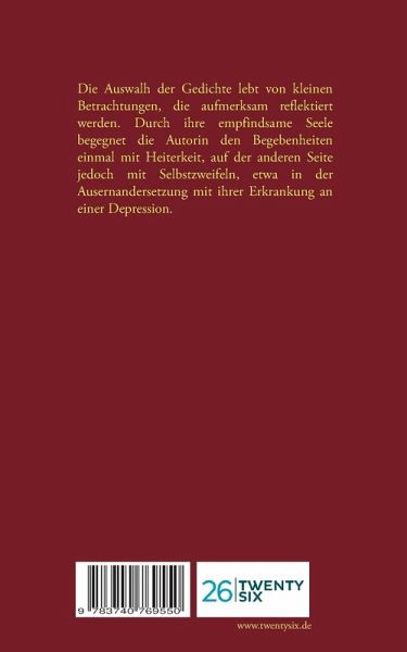 Die AuswaHL der Gedichte lebt von kleinen Betrachtungen, die aufmerksam reflektiert werden. Durch ihre empfindsame Seele begegnet die Autorin den Begebenheiten einmal mit Heiterkeit, auf der anderen Seite jedoch mit Selbstzweifeln, etwa in der Auseinandersetzung mit ihrer Erkrankung an einer Depression.