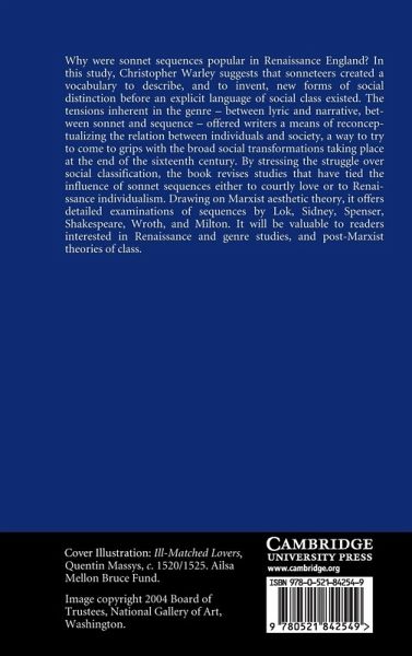 Why were sonnet sequences popular in Renaissance England? In this study, Christopher Warley suggests that sonneteers created a vocabulary to describe, and to invent, new forms of social distinction before an explicit language of social class existed. The tensions inherent in the genre - between lyric and narrative, between sonnet and sequence - offered writers a means of reconceptualizing the relation between individuals and society, a way to try to come to grips with the broad social transformations taking place at the end of the sixteenth century. By stressing the struggle over social classification, the book revises studies that have tied the influence of sonnet sequences to either courtly love or to Renaissance individualism. Drawing on Marxist aesthetic theory, it offers detailed examinations of sequences by Lok, Sidney, Spenser, Shakespeare and Milton. It will be valuable to readers interested in Renaissance and genre studies, and post-Marxist theories of class.