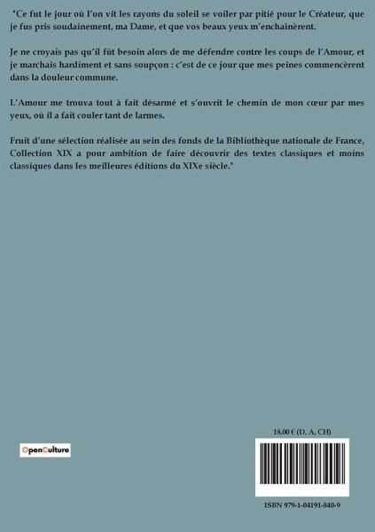 "Ce fut le jour où l¿on vit les rayons du soleil se voiler par pitié pour le Créateur, que je fus pris soudainement, ma Dame, et que vos beaux yeux m¿enchaînèrent. Je ne croyais pas qüil fût besoin alors de me défendre contre les coups de l¿Amour, et je marchais hardiment et sans soupçon : c¿est de ce jour que mes peines commencèrent dans la douleur commune. L¿Amour me trouva tout à fait désarmé et s¿ouvrit le chemin de mon c¿ur par mes yeux, où il a fait couler tant de larmes. Fruit d¿une sélection réalisée au sein des fonds de la Bibliothèque nationale de France, Collection XIX a pour ambition de faire découvrir des textes classiques et moins classiques dans les meilleures éditions du XIXe siècle."