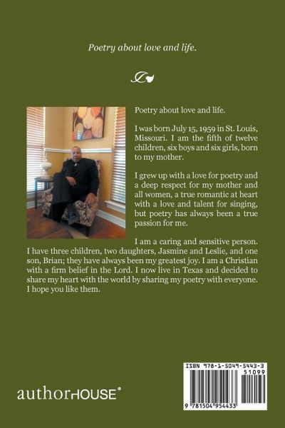 Poetry about love and life. I was born July 15, 1959 in St. Louis, Missouri. I am the fifth of twelve children, six boys and six girls, born to my mother. I grew up with a love for poetry and a deep respect for my mother and all women, a true romantic at heart with a love and talent for singing, but poetry has always been a true passion for me. I am a caring and sensitive person. I have three children, two daughters, Jasmine and Leslie, and one son, Brian; they have always been my greatest joy. I am a Christian with a firm belief in the Lord. I now live in Texas and decided to share my heart with the world by sharing my poetry with everyone. I hope you like them.
