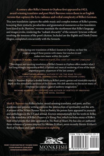 "On the centennial of the first appearance (1923) of Rilke's Sonnets to Orpheus, award-winning translator Mark Burrows reveals their depth and meaning with a brilliant new introduction and translation. This new translation captures the lyric beauty of Rilke's poems, honoring their syntactic peculiarities and grammatical complexities as few translators have dared to do. Burrows' versions maintain the essential strangeness of language and abruptness of metaphor by which the sonnets attain their distinctive character in German. Burrows' approach replicates what one reviewer describes as the poems' "dazzling obscurity," refusing to resolve the deliberate difficulties Rilke's formulations present. The effect invites readers to linger with these sonnets, allowing themselves to be shaped in their encounter with them"--