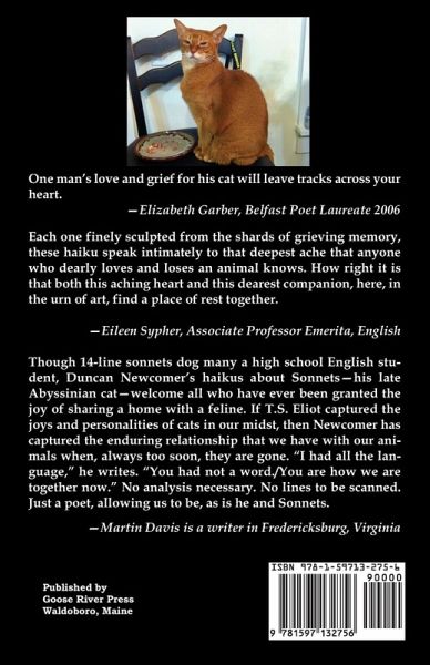 Spare, raw, exquisite, these elegiac haiku speak for all of us who have lost our beloved animals. -Eileen Sypher The theme of an elegy. The form of a haiku. But elegies are usually not for cats, and haiku mostly have a set number of syllables. Yet the pain of parting with your cat or your dog is both deep and unique. It is a grief most of us keep to ourselves. It is magnified because we live inside with them, and with our birds and turtles, sometimes fish and snakes. Up here in Maine, in the old days, the animal barn and the household were connected against the winter. In even older days, many of the necessary animals lived right in our dwellings as well, their warmth important for us. From gerbils to horses, we physically love and spiritually bond with animals that are not us. We rarely speak of this when they die. We don't know what to say. They were mainly silent with us and now we are silent without them. So, raw haiku, renegade haiku, all with the tone of elegy, might be a new form of language for an ancient grief. Try them yourself. When my wife and I drove home from the veterinary clinic after Sonnets had stretched out her front paws and died, I was numb and silent. Some months later these awkward but apt little phrases came to me. Over some weeks there were more and more. It was like playing with Sonnets again. I decided to call them Raw Haiku. "Duncan," writes the English professor, Dr. Sypher and the ordained minister, Rev. Eileen, "is a poet, preacher, psychotherapist, who probes with rare words of love, what few of us are able to: the raw edges of this awful grief. He makes Sonnets famous 'for sad people everywhere.' These poems open worlds."