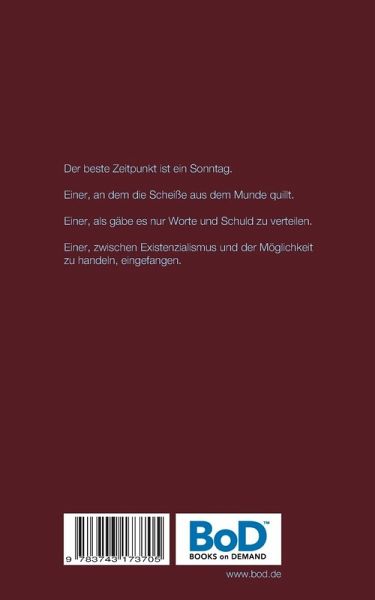 Der beste Zeitpunkt ist ein Sonntag.Einer, an dem die Scheiße aus dem Munde quillt.Einer, als gäbe es nur Worte und Schuld zu verteilen. Einer, zwischen Existenzialismus und der Möglichkeit zu handeln, eingefangen.