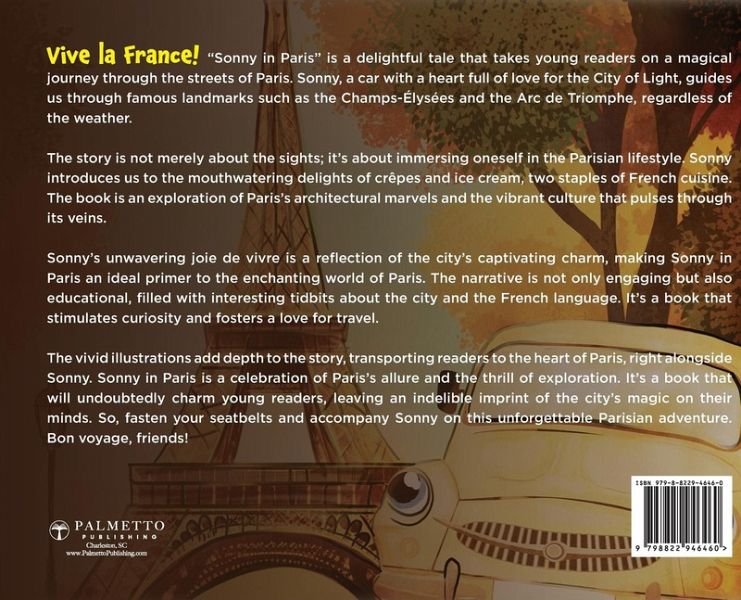 Embark on an enchanting journey with a friendly car through Paris's iconic landmarks! Experience the magic of the Eiffel Tower, the grandeur of Notre Dame, and indulge in tasty French treats. A delightful adventure awaits young explorers in the City of Light! In Sonny in Paris, our four-wheeled hero, Sonny the Skoda, takes you on a captivating tour of the French capital. From the bustling Champs-Élysées to the majestic Arc de Triomphe, Sonny's love for Paris is unwavering, rain or shine. His journey is not just about sightseeing; it's about savoring the essence of Parisian life. As Sonny navigates the city's charming streets, he introduces young readers to the delectable world of crêpes and ice cream, two of France's beloved culinary delights. Sonny in Paris is more than a story; it's an experience. Each page turn immerses readers in the city's timeless allure, painting a vivid picture of its architectural wonders and the vibrant culture that thrives within its boundaries. Sonny's infectious joie de vivre is a testament to the city's enchanting spirit, making this book a perfect introduction to the City of Light. The narrative is engaging and filled with fun facts about Paris, making it an educational read as well. It's a book that not only entertains but also inspires a sense of curiosity and a love for travel and language. The beautiful illustrations bring the story to life, making readers feel as if they are right there with Sonny, exploring the city. Sonny in Paris is a charming tale that celebrates the beauty of Paris and the joy of discovery. It's a book that will surely captivate young imaginations, leaving them with a lasting impression of the city's magic. So, buckle up and join Sonny on this unforgettable journey. Bon voyage, friends!