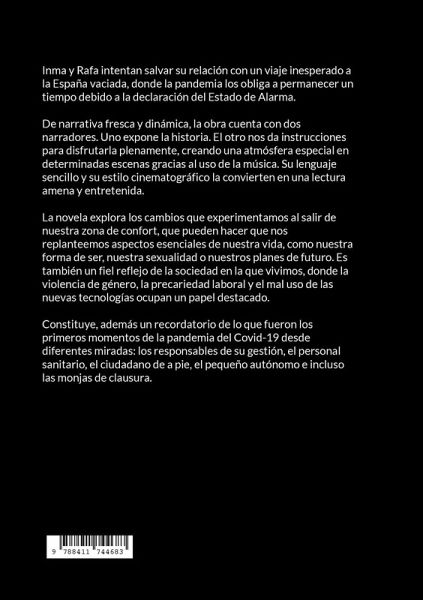 Inma y Rafa intentan salvar su relación con un viaje inesperado a la España vaciada, donde la pandemia los obliga a permanecer un tiempo debido a la declaración del Estado de Alarma. De narrativa fresca y dinámica, la obra cuenta con dos narradores. Uno expone la historia. El otro nos da instrucciones para disfrutarla plenamente, creando una atmósfera especial en determinadas escenas gracias al uso de la música. Su lenguaje sencillo y su estilo cinematográfico la convierten en una lectura amena y entretenida. La novela explora los cambios que experimentamos al salir de nuestra zona de confort, que pueden hacer que nos replanteemos aspectos esenciales de nuestra vida, como nuestra forma de ser, nuestra sexualidad e incluso nuestro futuro. Es también un fiel reflejo de la sociedad en la que vivimos, donde la violencia doméstica, la precariedad laboral y el mal uso de las nuevas tecnologías ocupan un papel destacado. Constituye, además un recordatorio de lo que fueron los primeros momentos de la pandemia del Covid-19 desde diferentes miradas: los responsables de su gestión, el personal sanitario, el ciudadano de a pie, el pequeño autónomo e incluso las monjas de clausura.