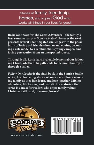 Rosie can't wait for The Great Adventure - the family's first summer camp at Sonrise Stable! However the week presents several unanticipated challenges with the possibility of losing old friends - human and equine, becoming a role model to a rambunctious young camper, and facing persecution from an unexpected source. Through it all, Rosie learns valuable lessons about following Christ, whether His path leads to the mountaintop or through a valley. Follow Our Leader - Book 6 in the Sonrise Stable series.