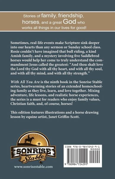 Join Rosie, Carrie and their family in another adventure in this 9th book in the Sonrise Stable series of horse fiction books for children. Sometimes, real-life events make Scripture sink deeper into our hearts than any sermon or Sunday school class. Rosie couldn't have imagined that bull riding, a kind Amish family, and a mystery involving five Saddlebred horses would help her come to truly understand the commandment Jesus called the greatest: "And thou shalt love the LORD thy God with all thy heart, and with all thy soul, and with all thy mind, and with all thy strength."