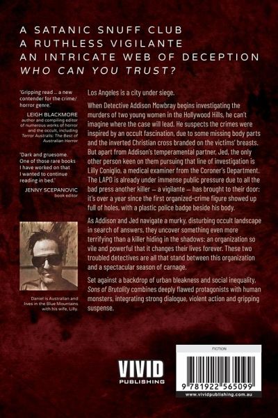 A SATANIC SNUFF CLUB A RUTHLESS VIGILANTE AN INTRICATE WEB OF DECEPTION WHO CAN YOU TRUST? Los Angeles is a city under siege. When Detective Addison Mowbray begins investigating the murders of two young women in the Hollywood Hills, he can't imagine where the case will lead. He suspects the crimes were inspired by an occult fascination, due to some missing body parts and the inverted Christian cross branded on the victims' breasts. But apart from Addison's temperamental partner, Jed, the only other person keen on them pursuing that line of investigation is Lilly Coniglio, a medical examiner from the Coroner's Department. The LAPD is already under immense public pressure due to all the bad press another killer - a vigilante - has brought to their door: it's been over a year since the first organized-crime figure showed up full of holes, with a plastic police badge beside his body. As Addison and Jed navigate a murky, disturbing occult landscape in search of answers, they uncover something even more terrifying than a killer hiding in the shadows: an organization so vile and powerful that it changes their lives forever. These two troubled detectives are all that stand between this organization and a spectacular season of carnage. Set against a backdrop of urban bleakness and social inequality, Sons of Brutality combines deeply flawed protagonists with human monsters, integrating strong dialogue, violent action and gripping Suspense.