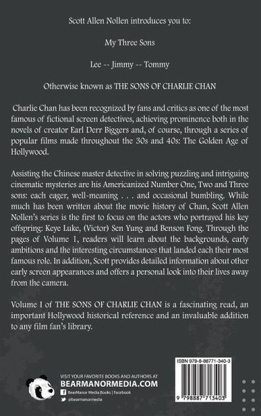Scott Allen Nollen introduces you to: My Three Sons Lee - Jimmy - Tommy Otherwise known as THE SONS OF CHARLIE CHAN Charlie Chan has been recognized by fans and critics as one of the most famous of fictional screen detectives, achieving prominence both in the novels of creator Earl Derr Biggers and, of course, through a series of popular films made throughout the 30s and 40s: The Golden Age of Hollywood. Assisting the Chinese master detective in solving puzzling and intriguing cinematic mysteries are his Americanized Number One, Two and Three sons: each eager, well-meaning . . . and occasional bumbling. While much has been written about the movie history of Chan, Scott Allen Nollen's series is the first to focus on the actors who portrayed his key offspring: Keye Luke, (Victor) Sen Yung and Benson Fong. Through the pages of Volume 1, readers will learn about the backgrounds, early ambitions and the interesting circumstances that landed each their most famous role. In addition, Scott provides detailed information about other early screen appearances and offers a personal look into their lives away from the camera. Volume I of THE SONS OF CHARLIE CHAN is a fascinating read, an important Hollywood historical reference and an invaluable addition to any film fan's library.