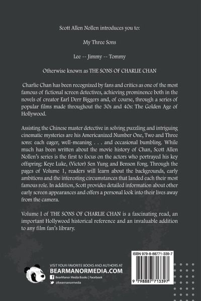 Scott Allen Nollen introduces you to: My Three Sons Lee - Jimmy - Tommy Otherwise known as THE SONS OF CHARLIE CHAN Charlie Chan has been recognized by fans and critics as one of the most famous of fictional screen detectives, achieving prominence both in the novels of creator Earl Derr Biggers and, of course, through a series of popular films made throughout the 30s and 40s: The Golden Age of Hollywood. Assisting the Chinese master detective in solving puzzling and intriguing cinematic mysteries are his Americanized Number One, Two and Three sons: each eager, well-meaning . . . and occasional bumbling. While much has been written about the movie history of Chan, Scott Allen Nollen's series is the first to focus on the actors who portrayed his key offspring: Keye Luke, (Victor) Sen Yung and Benson Fong. Through the pages of Volume 1, readers will learn about the backgrounds, early ambitions and the interesting circumstances that landed each their most famous role. In addition, Scott provides detailed information about other early screen appearances and offers a personal look into their lives away from the camera. Volume I of THE SONS OF CHARLIE CHAN is a fascinating read, an important Hollywood historical reference and an invaluable addition to any film fan's library.