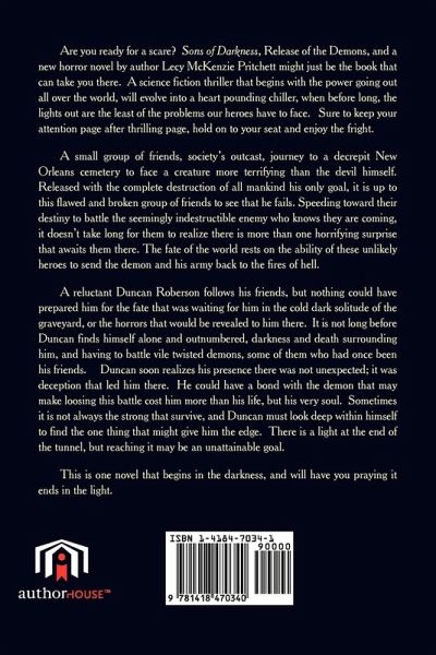 Are you ready for a scare? Sons of Darkness, Release of the Demons, and a new horror novel by author Lecy McKenzie Pritchett might just be the book that can take you there. A science fiction thriller that begins with the power going out all over the world, will evolve into a heart pounding chiller, when before long, the lights out are the least of the problems our heroes have to face. Sure to keep your attention page after thrilling page, hold on to your seat and enjoy the fright. A small group of friends, society's outcast, journey to a decrepit New Orleans cemetery to face a creature more terrifying than the devil himself. Released with the complete destruction of all mankind his only goal, it is up to this flawed and broken group of friends to see that he fails. Speeding toward their destiny to battle the seemingly indestructible enemy who knows they are coming, it doesn't take long for them to realize there is more than one horrifying surprise that awaits them there. The fate of the world rests on the ability of these unlikely heroes to send the demon and his army back to the fires of hell. A reluctant Duncan Roberson follows his friends, but nothing could have prepared him for the fate that was waiting for him in the cold dark solitude of the graveyard, or the horrors that would be revealed to him there. It is not long before Duncan finds himself alone and outnumbered, darkness and death surrounding him, and having to battle vile twisted demons, some of them who had once been his friends. Duncan soon realizes his presence there was not unexpected; it was deception that led him there. He could have a bond with the demon that may make loosing this battle cost him more than his life, but his very soul. Sometimes it is not always the strong that survive, and Duncan must look deep within himself to find the one thing that might give him the edge. There is a light at the end of the tunnel, but reaching it may be an unattainable goal.