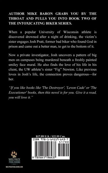 AUTHOR MIKE BARON GRABS YOU BY THE THROAT AND PULLS YOU INTO BOOK TWO OF THE INTOXICATING BIKER SERIES. When a popular University of Wisconsin athlete is discovered drowned after a night of drinking, the victim's sister engages Josh Pratt, former bad biker who found God in prison and came out a better man, to get to the bottom of it. Now a private investigator, Josh uncovers a pattern of big men on campuses being murdered beneath a freshly painted smiley face mural. He also finds the love of his life in his client, the UW athlete's sister "Fig" Newton. Like previous loves in Josh's life, the connection proves dangerous--for her. "If you like books like 'The Destroyer', 'Levon Cade' or 'The Executioner' books, then this novel is for you. Give it a read, you will love it."
