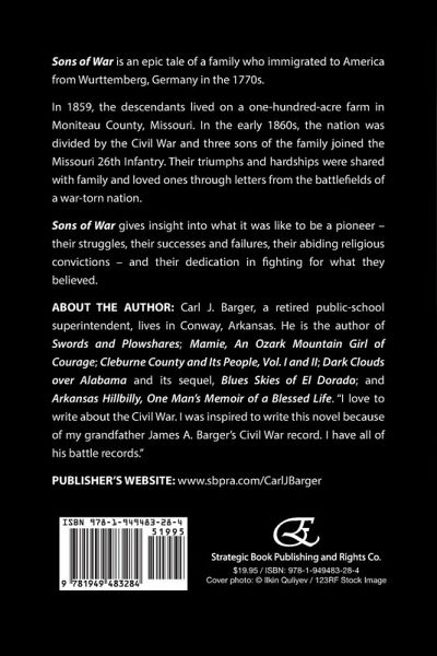 Sons of War is an epic tale of a family who immigrated to America from Wurttemberg, Germany in the 1770s. In 1859, the descendants lived on a one-hundred-acre farm in Moniteau County, Missouri. In the early 1860s, the nation was divided by the Civil War and three sons of the family joined the Missouri 26th Infantry. Their triumphs and hardships were shared with family and loved ones through letters from the battlefields of a war-torn nation. Sons of War gives insight into what it was like to be a pioneer - their struggles, their successes and failures, their abiding religious convictions - and their dedication in fighting for what they believed. About the Author: Carl J. Barger, a retired public-school superintendent, lives in Conway, Arkansas. He is the author of Swords and Plowshares; Mamie, An Ozark Mountain Girl of Courage; Cleburne County and Its People, Vol. I and II; Dark Clouds over Alabama and its sequel, Blues Skies of El Dorado; and Arkansas Hillbilly, One Man's Memoir of a Blessed Life. "I love to write about the Civil War. I was inspired to write this novel because of my grandfather James A. Barger's Civil War record. I have all of his battle records."