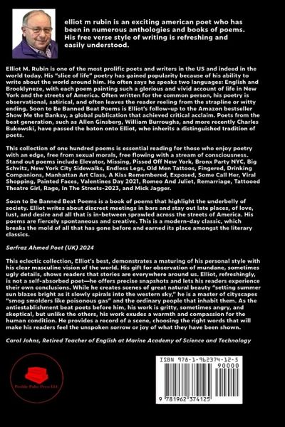 Dive into the rebellious and thought-provoking world of 'Soon to Be Banned Beat Poems' by Elliot M. Rubin. This upcoming release takes readers on a captivating journey through the raw and unfiltered expressions of beat poetry. Rubin's collection, filled with vibrant verses and poignant prose, captures the essence of the Beat Generation, pushing boundaries and challenging societal norms. With themes ranging from existential pondering to passionate manifestos, each poem in this collection serves as a testament to the enduring spirit of counterculture. Brace yourself for a literary experience that transcends convention and invites readers to explore the depths of self-discovery and societal critique. 'Soon to Be Banned Beat Poems' is not just a collection of verses; it's a rebellious ode to the enduring power of poetic expression in the face of societal constraints. Carol Johns stated: This eclectic collection, Elliot's best, demonstrates a maturing of his personal style with his clear masculine vision of the world. His gift for observation of mundane, sometimes ugly details, shows readers that stories are everywhere around us. Elliot, refreshingly, is not a self-absorbed poet-he offers precise snapshots and lets his readers experience their own conclusions. While he creates scenes of great natural beauty "setting summer sun blazes bright as it slowly spirals into the western sky," he is a master of cityscapes "smog smolders like poisonous gas" and the ordinary people that inhabit them. As the antiestablishment beat poets before him, his work is gritty, sometimes angry, and skeptical, but unlike the others, his work exudes a warmth and compassion for the human condition. He provides a record of a scene, choosing the right words that will make his readers feel the unspoken sorrow or joy of what they have been shown. Carol Johns, Retired Teacher of English at Marine Academy of Science and Technology
