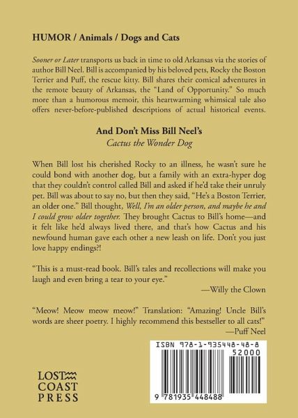Sooner or Later takes the reader to old Arkansas via the life of Bill Neel. Bill is accompanied by his pets, Rocky the Boston Terrier (aka, Rocky the Wonder Dog) and Puff, the rescue kitty. Bill shares their adventures together in the remote beauty of Arkansas, the Land of Opportunity. This book is so much more than a humorous memoir. It describes historical events in Arkansas (even about Wal-Mart), that have never before been published.
