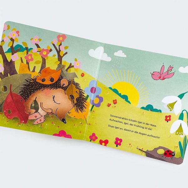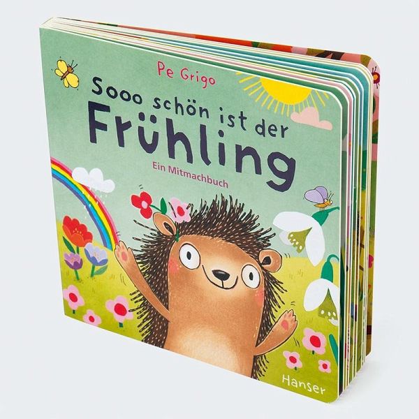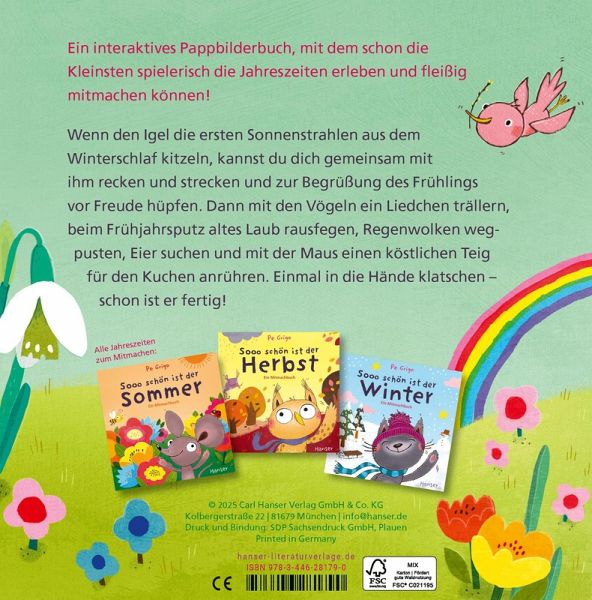Klatschen, hüpfen und Regenwolken wegpusten - mit Igel und Maus den Frühling erleben! Der dritte Band der Jahreszeiten-Reihe für Kinder ab 2 Jahren mit Illustrationen von Pe GrigoEine interaktive, fröhliche und bunte Pappbilderbuch-Reihe, bei der Kinder die Jahreszeiten erleben können, indem sie fleißig mitmachen: Im Frühling, wenn den Igel die ersten Sonnenstrahlen aus dem Winterschlaf kitzeln, können sich kleine Leser:innen gemeinsam mit ihm recken und strecken und zur Begrüßung des Frühlings vor Freude hüpfen. Dann mit den Vögeln ein Liedchen trällern, beim Frühjahrsputz Laub wegfegen, Regenwolken wegpusten, Eier suchen und mit der Maus einen köstlichen Teig für den Kuchen anrühren. Einmal in die Hände klatschen - schon ist er fertig!
