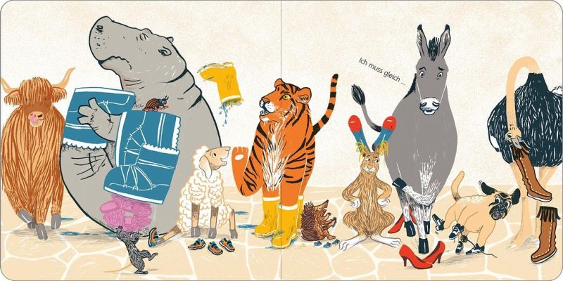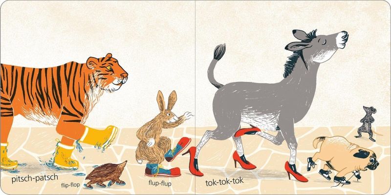 Die Spannung ist groß, wenn Nilpferd, Schaf, Strauß und viele weitere Tiere sich zu einer Schuhparade treffen. Der Esel stolziert elegant mit seinen Stöckelschühchen - tok, tok, tok - der Tiger kommt mit seinen nassen Gummistiefeln angeschlurft - pitsch, patsch. Und der Igel? Der trägt heute seine bunten Flip-Flops - flip, flop.