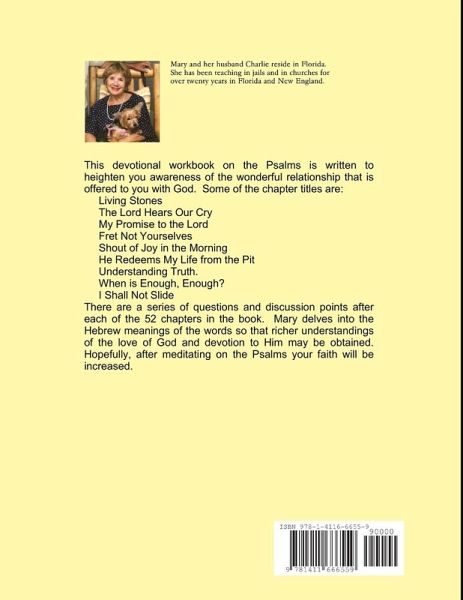 Description: This devotional workbook on the Psalms for Bible studies is written to heighten awareness of the wonderful relationship that is offered with God. Some of the chapter titles are Glory of God's Name, As For Me, When is Enough, Enough, Protection From Sin, Understanding Truth, He Redeems My Life From the Pit, Fullness of Joy, I Will Not Return to Folly, Know the Joyful Sound, A Different Taste in Our Mouths.... At the end of each chapter, a series of questions are asked and the final line is a discussion point from the text. The author delves into the Hebrew meanings of the words so that a richer understanding of the love of God and devotion to Him may be obtained. Hopefully, after meditating on the Psalms, your faith will be increased.