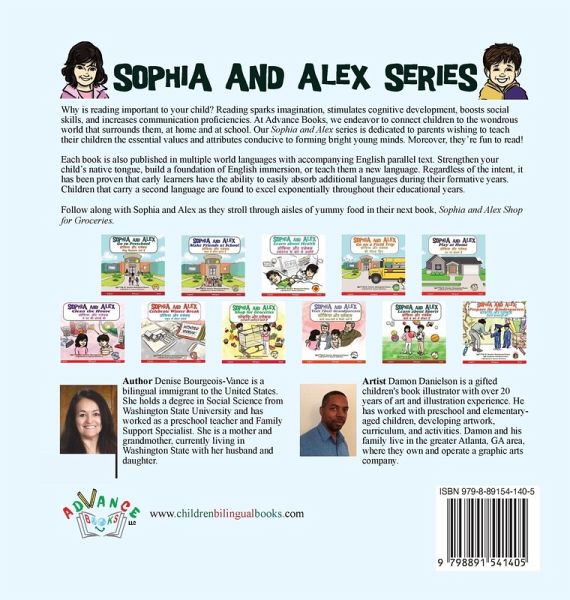 "Sophia and Alex Celebrate Winter Break" is one of eleven volumes in the "Sophia and Alex" series, written by Author Denise Bourgeois-Vance and illustrated by Artist Damon Danielson. The theme of the book centers on Sophia and Alex experiencing family traditions and recognizing other customs from cultures found around the world. The children learn that every tradition has value within a given culture or family and should be celebrated as each family wishes. The 32-page illustrated book shows varying types of customs, religions, and cultures so that children know that even though we don't all think, believe, or feel the same, that's ok. They learn at an early age that differences exist in the world, and this is what makes life so interesting. Each book in the "Sophia and Alex" series draws on storylines based on common events found in the life of an early learner. Children relate to the multi-cultural characters and learn the art of acceptance and inclusion in school and home settings. Through the use of dual text, the child can simultaneously learn to read in Hindi or English while better expressing themselves in each. Studies prove that bilingual children are more apt to excel in writing and reading in subsequent grades when given the tools at an early age. At the time of this printing, over two dozen languages have been added to the series by the Children Bilingual Books' pool of translators. Parents and grandparents alike cherish the opportunity to connect with their child through reading in their native tongue. Why is reading important to your child? Reading sparks imagination, stimulates cognitive development, boosts social skills, and increases communication proficiencies. At Children Bilingual Books, we endeavor to connect children of all ethnicities, races, cultures, and languages with the wondrous world that surrounds them. The Sophia and Alex series provides a pathway to a child's understanding of language and social interaction. Moreover, they're fun to read!