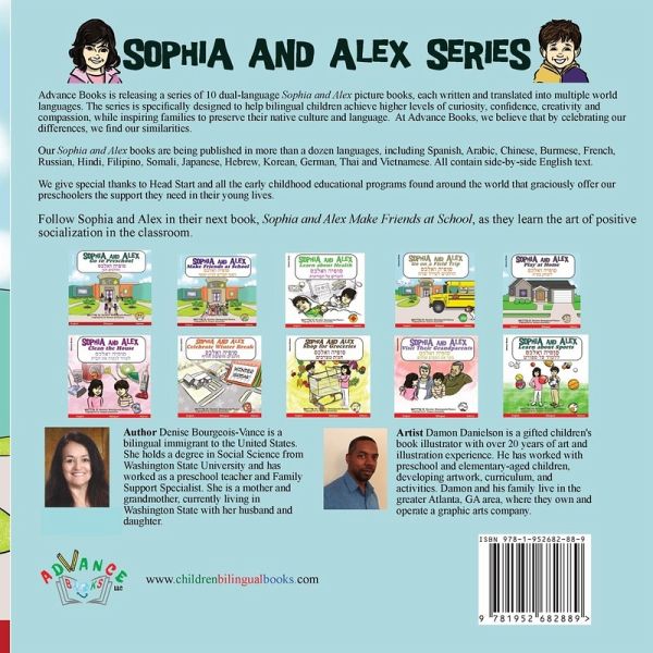 Sophia and Alex Go to Preschool takes you and your child into the classroom to experience the activities and interaction common to most preschools. This 32-page beautifully illustrated picture book gives parents a tool to ensure their child is ready on their first day of class. Advance Books is a publisher of children bilingual books containing side-by-side Hebrew and English text. Our books are similarly translated into other world languages in paperback version. The Sophia and Alex 10-book series is intended to ensure early dual-language learners feel connected with the wondrous world around them. Reading the series will help bilingual children reach higher levels of creativity, curiosity, cognition, social awareness and emotional well-being, all conducive in preparation for subsequent language immersion programs. Follow Sophia and Alex through their first five books as they navigate the classroom and integrate their learnings back into the home. Continue the journey in the next five books, due to release in the spring of 2020. You will relish the diversity of charters and fall in love with Sophia and Alex as they experience daily life events as seen through the eyes of a child. The beautifully illustrated pages tell the story, and the stories will undoubtedly connect you with your child or grandchild through the sharing of a common language and culture. We invite parents and children to celebrate the diversity of life, and support the effort to publish more bilingual works for our young readers.