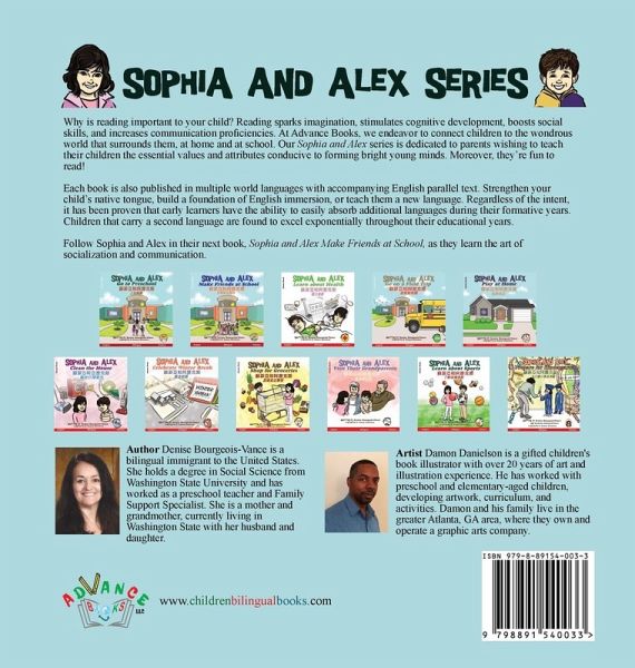 "Sophia and Alex Go to Preschool" is the first of eleven volumes in the "Sophia and Alex" series, written by Author Denise Bourgeois-Vance and illustrated by Artist Damon Danielson. The story takes our two main characters, fraternal twins Sophia and Alex, to their first day of preschool where they meet their new teacher, Miss Anna. The children learn about the classroom and the fun activities planned for the day with children of diverse backgrounds. The 32-page illustrated book addresses separation anxiety, meeting and interacting with peers and adults, displaying appropriate behavior, and adapting to new environments through positive reinforcement. Children learn the social and communitive skills needed to succeed in a controlled learning environment. Each book in the "Sophia and Alex" series draws on storylines based on common events found in the life of an early learner. Children relate to the multi-cultural characters and learn the art of acceptance and inclusion in school and home settings. Through the use of dual text, the child can simultaneously learn to read in Chinese or English while better expressing themselves in each. Studies prove that bilingual children are more apt to excel in writing and reading in subsequent grades when given the tools at an early age. At the time of this printing, over two dozen languages have been added to the series by the Children Bilingual Books' pool of translators. Parents and grandparents alike cherish the opportunity to connect with their child through reading in their native tongue. Why is reading important to your child? Reading sparks imagination, stimulates cognitive development, boosts social skills, and increases communication proficiencies. At Children Bilingual Books, we endeavor to connect children of all ethnicities, races, cultures, and languages with the wondrous world that surrounds them. The Sophia and Alex series provides a pathway to a child's understanding of language and social interaction. Moreover, they're fun to read!