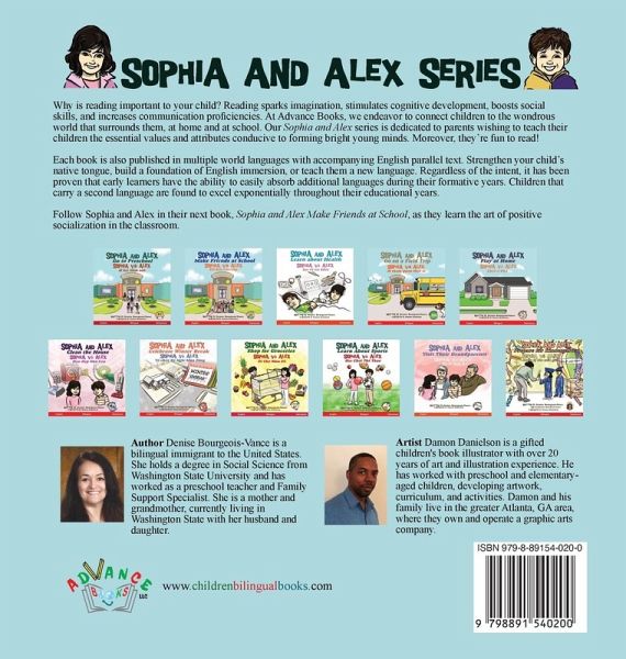 "Sophia and Alex Go to Preschool" is the first of eleven volumes in the "Sophia and Alex" series, written by Author Denise Bourgeois-Vance and illustrated by Artist Damon Danielson. The story takes our two main characters, fraternal twins Sophia and Alex, to their first day of preschool where they meet their new teacher, Miss Anna. The children learn about the classroom and the fun activities planned for the day with children of diverse backgrounds. The 32-page illustrated book addresses separation anxiety, meeting and interacting with peers and adults, displaying appropriate behavior, and adapting to new environments through positive reinforcement. Children learn the social and communitive skills needed to succeed in a controlled learning environment. Each book in the "Sophia and Alex" series draws on storylines based on common events found in the life of an early learner. Children relate to the multi-cultural characters and learn the art of acceptance and inclusion in school and home settings. Through the use of dual text, the child can simultaneously learn to read in Vietnamese or English while better expressing themselves in each. Studies prove that bilingual children are more apt to excel in writing and reading in subsequent grades when given the tools at an early age. At the time of this printing, over two dozen languages have been added to the series by the Children Bilingual Books' pool of translators. Parents and grandparents alike cherish the opportunity to connect with their child through reading in their native tongue. Why is reading important to your child? Reading sparks imagination, stimulates cognitive development, boosts social skills, and increases communication proficiencies. At Children Bilingual Books, we endeavor to connect children of all ethnicities, races, cultures, and languages with the wondrous world that surrounds them. The Sophia and Alex series provides a pathway to a child's understanding of language and social interaction. Moreover, they're fun to read!