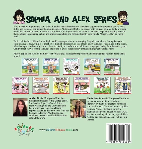 "Sophia and Alex Prepare for Kindergarten" is one of eleven volumes in the "Sophia and Alex" series, written by Author Denise Bourgeois-Vance and illustrated by Artist Damon Danielson. This book is intended to provide a review of preschool prior to a child attending their first day of kindergarten. Sophia and Alex look back over their graduation from preschool and prepare themselves for a new adventure in learning. Fun games are implemented to review concepts of math, reading, and writing so as to lessen any anxiety associated with attending a new school. The 32-page illustrated book informs parents of the levels of competence their child should obtain as they enter kindergarten. Both parent and child learn fun activities that can be applied at home while reviewing such things as counting, color identification, reciting the alphabet, and good behavior in the classroom. A child that is socially, emotionally, and academically ready for kindergarten is destined to thrive in their new environment. Each book in the "Sophia and Alex" series draws on storylines based on common events found in the life of an early learner. Children relate to the multi-cultural characters and learn the art of acceptance and inclusion in school and home settings. Through the use of dual text, the child can simultaneously learn to read in Burmese or English while better expressing themselves in each. Studies prove that bilingual children are more apt to excel in writing and reading in subsequent grades when given the tools at an early age. At the time of this printing, over two dozen languages have been added to the series by the Children Bilingual Books' pool of translators. Parents and grandparents alike cherish the opportunity to connect with their child through reading in their native tongue. Why is reading important to your child? Reading sparks imagination, stimulates cognitive development, boosts social skills, and increases communication proficiencies. At Children Bilingual Books, we endeavor to connect children of all ethnicities, races, cultures, and languages with the wondrous world that surrounds them. The Sophia and Alex series provides a pathway to a child's understanding of language and social interaction. Moreover, they're fun to read!