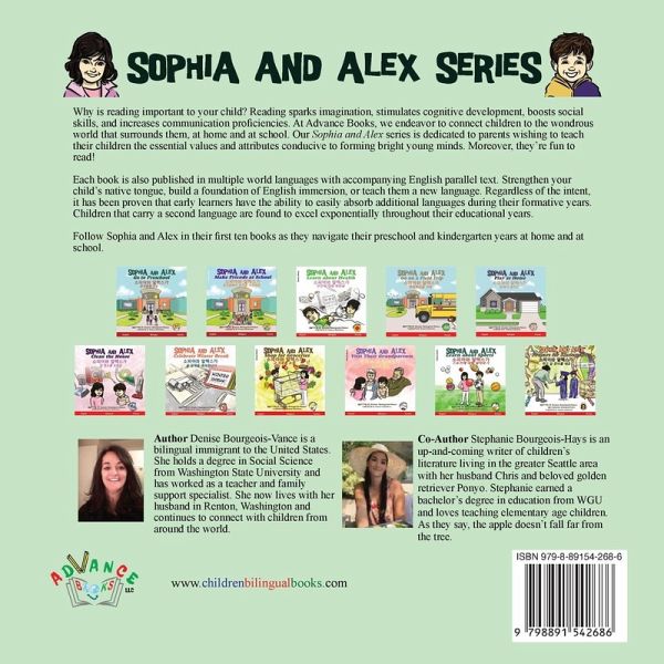 "Sophia and Alex Prepare for Kindergarten" is one of eleven volumes in the "Sophia and Alex" series, written by Author Denise Bourgeois-Vance and illustrated by Artist Damon Danielson. This book is intended to provide a review of preschool prior to a child attending their first day of kindergarten. Sophia and Alex look back over their graduation from preschool and prepare themselves for a new adventure in learning. Fun games are implemented to review concepts of math, reading, and writing so as to lessen any anxiety associated with attending a new school. The 32-page illustrated book informs parents of the levels of competence their child should obtain as they enter kindergarten. Both parent and child learn fun activities that can be applied at home while reviewing such things as counting, color identification, reciting the alphabet, and good behavior in the classroom. A child that is socially, emotionally, and academically ready for kindergarten is destined to thrive in their new environment. Each book in the "Sophia and Alex" series draws on storylines based on common events found in the life of an early learner. Children relate to the multi-cultural characters and learn the art of acceptance and inclusion in school and home settings. Through the use of dual text, the child can simultaneously learn to read in Korean or English while better expressing themselves in each. Studies prove that bilingual children are more apt to excel in writing and reading in subsequent grades when given the tools at an early age. At the time of this printing, over two dozen languages have been added to the series by the Children Bilingual Books' pool of translators. Parents and grandparents alike cherish the opportunity to connect with their child through reading in their native tongue. Why is reading important to your child? Reading sparks imagination, stimulates cognitive development, boosts social skills, and increases communication proficiencies. At Children Bilingual Books, we endeavor to connect children of all ethnicities, races, cultures, and languages with the wondrous world that surrounds them. The Sophia and Alex series provides a pathway to a child's understanding of language and social interaction. Moreover, they're fun to read!