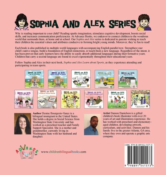 "Sophia and Alex Visit Their Grandparents" is one of eleven volumes in the "Sophia and Alex" series, written by Author Denise Bourgeois-Vance and illustrated by Artist Damon Danielson. Sophia and Alex's family embark on a journey to see their grandparents far away. The children learn that traveling may consist of many modes of transportation such as airplanes, trains, and cars. They also see unique interactions between their parents and their parent's parents, along with relationships within their extended family. The 32-page illustrated book shows the special relationship grandchildren have with their grandparents when compared to their own parents. They see the love that exists and the comfort gained from bonding with those who love them. The children realize that although separation can be difficult and sad, they still know their grandparents care for them wherever they may be. Each book in the "Sophia and Alex" series draws on storylines based on common events found in the life of an early learner. Children relate to the multi-cultural characters and learn the art of acceptance and inclusion in school and home settings. Studies prove that bilingual children are more apt to excel in writing and reading in subsequent grades when given the tools at an early age. At the time of this printing, over two dozen languages have been added to the series by the Children Bilingual Books' pool of translators. Parents and grandparents alike cherish the opportunity to connect with their child through reading in their native tongue. Why is reading important to your child? Reading sparks imagination, stimulates cognitive development, boosts social skills, and increases communication proficiencies. At Children Bilingual Books, we endeavor to connect children of all ethnicities, races, cultures, and languages with the wondrous world that surrounds them. The Sophia and Alex series provides a pathway to a child's understanding of language and social interaction. Moreover, they're fun to read!