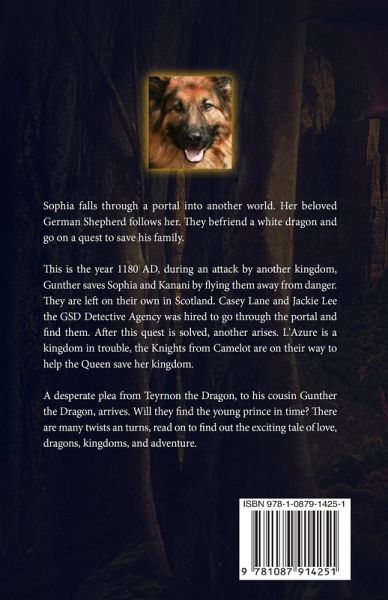 Sophia falls through a portal into another world. Her beloved German shepherd follows her. They befriend a white dragon and go on a quest to save his family. This is the year 1180 AD, during an attack from another kingdom. Gunther, the dragon, saves Sophia and Kanani by flying them away from danger. They are left on their own in Scotland. Casey Lane and Jackie Lee GSD Detective Agency was hired to go through a portal and find them. After this quest is solved, another arises. L'Azure is a kingdom in trouble, the Knights from Camelot are on their way to help save her kingdom. A desperate plea from Teyrnon the Dragon, to his cousin Gunther the dragon, arrives. Will they find the young prince in time? There are many twists and turns, read on to find out the exciting tale of love, dragons, kingdoms, and adventure. This book is combining 2 books, Sophia and the Dragons with The Dragons of L'Azure.