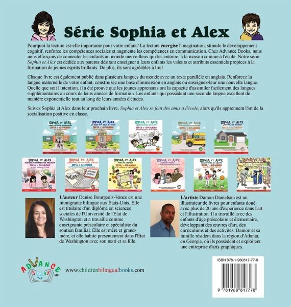 "Sophia et Alex vont à l'école maternelle" est le premier des onze volumes de la série "Sophia et Alex", écrit par l'auteur Denise Bourgeois-Vance et illustré par l'artiste Damon Danielson. L'histoire emmène nos deux personnages principaux, les jumeaux fraternels Sophia et Alex, à leur premier jour d'école maternelle où ils rencontrent leur nouvelle enseignante, Mlle Anna. Les enfants découvrent la classe et les activités amusantes prévues pour la journée avec les autres enfants. Le livre illustré de 32 pages traite de l'anxiété de séparation, de la rencontre et de l'interaction avec les pairs et les adultes, du comportement approprié et de l'adaptation à de nouveaux environnements grâce au renforcement positif. Les enfants acquièrent les compétences sociales, émotionnelles et cognitives nécessaires pour réussir dans un environnement d'apprentissage contrôlé. Chaque livre de la série "Sophia et Alex" s'inspire d'histoires basées sur des événements courants rencontrés dans la vie d'un jeune apprenant. Les enfants s'identifient aux personnages multiculturels et apprennent l'art de l'acceptation et de l'inclusion à l'école et à la maison. Grâce à l'utilisation du double texte, un enfant peut simultanément apprendre à lire en espagnol ou en anglais tout en s'exprimant mieux dans chacun. Des études prouvent que les enfants bilingues sont plus aptes à exceller en écriture et en lecture dans les années suivantes lorsqu'on leur donne les outils à un âge précoce. Au moment de cette impression, plus de 20 langues étaient proposées dans les livres bilingues pour enfants. Les parents et les grands-parents chérissent l'opportunité de se connecter avec leur enfant par le biais de la lecture. Pourquoi la lecture est-elle importante pour votre enfant ? La lecture stimule l'imagination, stimule le développement cognitif, renforce les compétences sociales et augmente les compétences en communication. Chez Children Bilingual Books, nous nous efforçons de connecter les enfants de toutes les ethnies, races, cultures et langues avec le monde merveilleux qui les entoure. La série Sophia et Alex fournit une voie vers la compréhension d'un enfant du langage et de l'interaction sociale. De plus, ils sont agréables à lire !