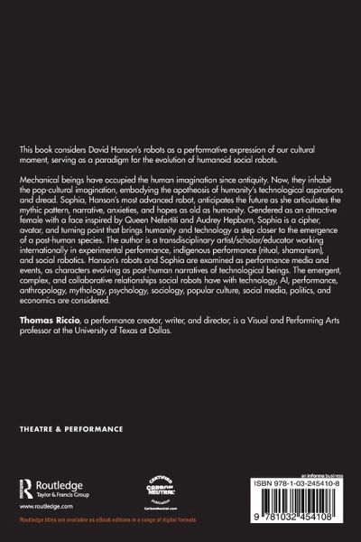 Mechanical beings have occupied the human imagination since antiquity. Now, they inhabit the pop-cultural imagination, embodying the apotheosis of humanity's technological aspirations and dread. Sophia, Hanson's most advanced robot, anticipates the future as she articulates the mythic pattern, narrative, anxieties, and hopes as old as humanity. Gendered as an attractive female with a face inspired by Queen Nefertiti and Audrey Hepburn, Sophia is a cipher, avatar, and turning point that brings humanity and technology a step closer to the emergence of a post-human species. The author is a transdisciplinary artist/scholar/educator working internationally in experimental performance, indigenous performance (ritual, shamanism), and social robotics. Hanson's robots and Sophia are examined as performance media and events, as characters evolving as post-human narratives of technological beings. The emergent, complex, and collaborative relationships social robots have with technology, AI, performance, anthropology, mythology, psychology, sociology, popular culture, social media, politics, and economics are considered.