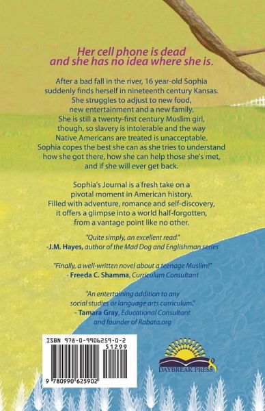 Her cell phone is dead, and she has no idea where she is. After a bad fall in the river, 16 year-old Sophia suddenly finds herself in nineteenth century Kansas. She struggles to adjust to new food, new entertainment and a new family. She is still a twenty-first century Muslim girl, though, so slavery is intolerable and the way Native Americans are treated is unacceptable. Sophia copes the best she can as she tries to understand how she got there, how she can help those she's met and if she will ever get back. Sophia's Journal is a fresh take on a pivotal moment in American history. Filled with adventure, romance and self-discovery, it offers a glimpse into a world half-forgotten, from a vantage point like no other. "Quite simply, an excellent read." -J.M. Hayes, author of the Mad Dog and Englishman series "Finally, a well-written novel about a teenage Muslim!" - Freeda C. Shamma, Curriculum Consultant "A valuable and entertaining addition to any social studies or language arts curriculum." -Tamara Gray, Educational Consultant and founder of Rabata.org