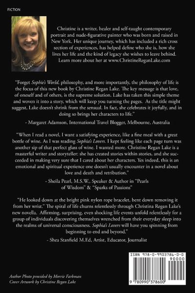 "When I read a novel, I want a satisfying experience, like a fine meal with a great bottle of wine. As I was reading Sophia's Lovers. I kept feeling like each page turn was another sip of that perfect glass of wine. I wanted more. Christine Regan Lake is a masterful writer and storyteller: she has created stories within stories, and she succeeded in making very sure that I cared about her characters. Yes indeed, this is an emotional and spiritual experience one doesn't usually encounter in a novel about love and death and retribution." - Sheila Pearl, M.S.W., Speaker & Author in "Pearls of Wisdom" & "Sparks of Passions"