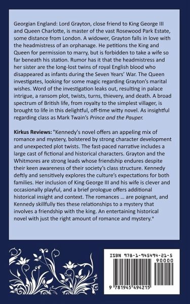Georgian England: Lord Grayton, a close friend to King George III and Queen Charlotte, is master of the vast Rosewood Park Estate, some distance from London. A widower, Grayton falls in love with the headmistress of an orphanage. He petitions the King and Queen for permission to marry but is forbidden to take a wife so far beneath his station. Rumor has it that the headmistress and her sister are the long-lost twins of royal English blood who disappeared as infants during the seven Years' War. The Queen investigates, looking for some magic regarding Grayton's martial wishes. Word of the investigation leaks out, resulting in palace intrigue, a ransom plot, twists, turns, thievery, and death. A broad spectrum of British life, from royalty to the simplest villager, is brought to life in this delightful, off-time witty novel. As insightful regarding class as Mark Twain's Prince and the Pauper.