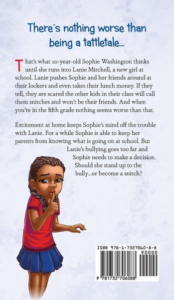 **Purple Dragonfly Book Award First Place Winner** Should Sophie Stand Up to the School Bully or Become a Snitch? There's nothing worse than being a tattletale... That's what 10-year-old Sophie Washington thinks until she runs into Lanie Mitchell, a new girl at school. Lanie pushes Sophie and her friends around at their lockers, and even takes their lunch money in this entertaining, illustrated chapter book for middle grade readers. If they tell, they are scared the other kids in their class will call them snitches and won't be their friends. And when you're in the fifth grade, nothing seems worse than that. Then a classmate gets seriously injured and Sophie needs to make a decision: fight back, or snitch? AN AMAZON BEST SELLING BOOK FOR KIDS! **Purple Dragonfly Book Award First Place Winner* Should Sophie Stand Up to the School Bully or Become a Snitch? There's nothing worse than being a tattletale... That's what 10-year-old Sophie Washington thinks until she runs into Lanie Mitchell, a new girl at school. Lanie pushes Sophie and her friends around at their lockers, and even takes their lunch money in this entertaining, illustrated chapter book for middle grade readers. If they tell, they are scared the other kids in their class will call them snitches and won't be their friends. And when you're in the fifth grade, nothing seems worse than that. Then a classmate gets seriously injured and Sophie needs to make a decision: fight back, or snitch? Here's what Goodreads reviewers say about Sophie Washington: The Snitch: "Great children's book that teaches children practical and valuable life lessons." "This would be a great book for the counselor, the library and the classroom ready for reading!" "I liked that, while a heavy subject matter, the book never felt preachy." "Good story about bullying and standing up for what's right." This is the second book in the Readers' Favorite five star rated Sophie Washington book series that includes:Sophie Washington: Queen of the Bee (Book 1) Sophie Washington: The Snitch (Book 2) Sophie Washington: Things You Didn't Know About Sophie (Book 3) Sophie Washington: The Gamer (Book 4) Sophie Washington: Hurricane (Book 5) Sophie Washington: Mission Costa Rica (Book 6) Sophie Washington: Secret Santa (Book 7) Sophie Washington: Code One (Book 8) Sophie Washington: Mismatch (Book 9) Sophie Washington: My BFF (Book 10) Sophie Washington: Class Retreat (Book 11) Kids Ages 8-12.
