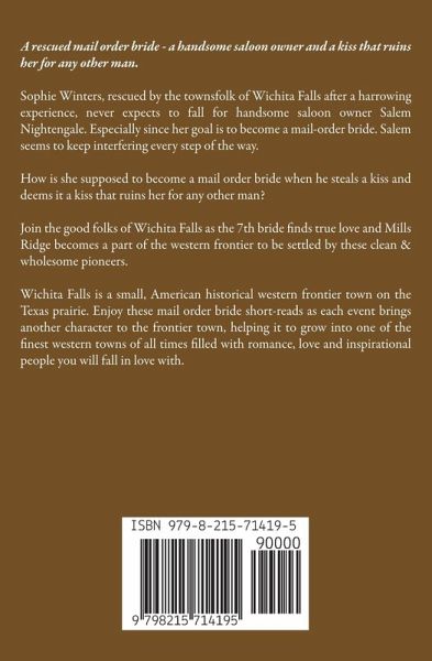 A rescued mail order bride - a handsome saloon owner and a kiss that ruins her for any other man. Sophie Winters, rescued by the townsfolk of Wichita Falls after a harrowing experience, never expects to fall for handsome saloon owner Salem Nightengale. Especially since her goal is to become a mail-order bride. Salem seems to keep interfering every step of the way. How is she supposed to become a mail order bride when he steals a kiss and deems it a kiss that ruins her for any other man? Join the good folks of Wichita Falls as the 7th bride finds true love and Mills Ridge becomes a part of the western frontier to be settled by these clean & wholesome pioneers. Wichita Falls is a small, American historical western frontier town on the Texas prairie. Enjoy these mail order bride short-reads as each event brings another character to the frontier town, helping it to grow into one of the finest western towns of all times filled with romance, love and inspirational people you will fall in love with.