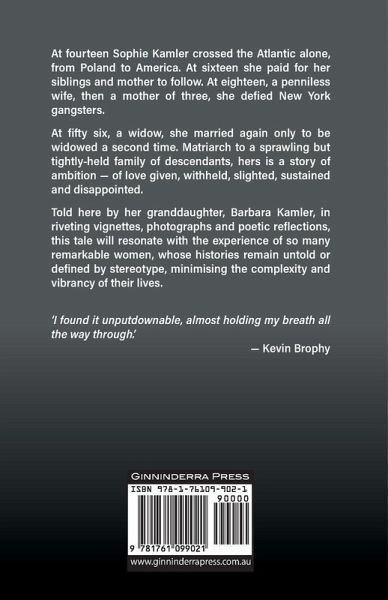 At fourteen Sophie Kamler crossed the Atlantic alone, from Poland to America. At sixteen she paid for her siblings and mother to follow. At eighteen, a penniless wife, then a mother of three, she defied New York gangsters. At fifty six, a widow, she married again only to be widowed a second time. Matriarch to a sprawling but tightly held family of descendants, hers is a story of ambition - of love given, withheld, slighted, sustained and disappointed. Told here by her granddaughter, Barbara Kamler, in riveting vignettes, photographs and poetic reflections, this tale will resonate with the experience of so many remarkable women, minimising the complexity and vibrancy of their lives.