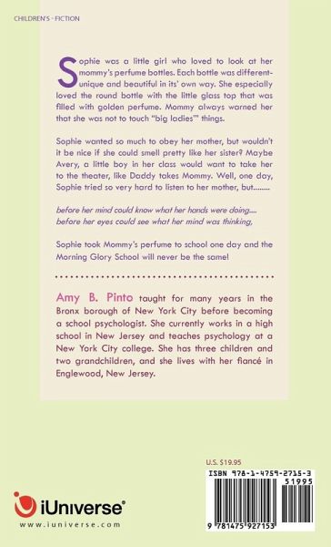Sophie was a little girl who loved to look at her mommy's perfume bottles. Each bottle was different-unique and beautiful in its' own way. She especially loved the round bottle with the little glass top that was filled with golden perfume. Mommy always warned her that she was not to touch "big ladies'" things. Sophie wanted so much to obey her mother, but wouldn't it be nice if she could smell pretty like her sister? Maybe Avery, a little boy in her class would want to take her to the theater, like Daddy takes Mommy. Well, one day, Sophie tried so very hard to listen to her mother, but........ before her mind could know what her hands were doing.... before her eyes could see what her mind was thinking, Sophie took Mommy's perfume to school one day and the Morning Glory School will never be the same!