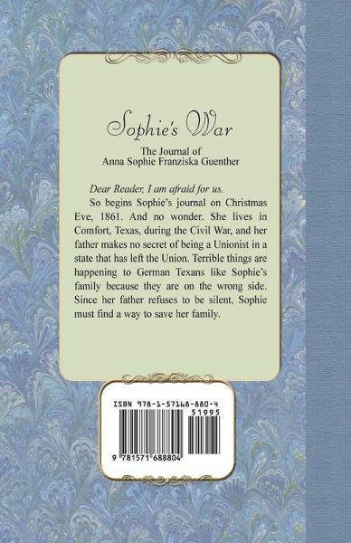 Dear Reader, I am afraid for us. So begins Sophie's journal on Christmas Eve, 1861. And no wonder. She lives in Comfort, Texas, during the Civil War, and her father makes no secret of being a Unionist in a state that has left the Union. Terrible things are happening to German Texans like Sophie's family because they are on the wrong side. Since her father refuses to be silent, Sophie must find a way to save her family.