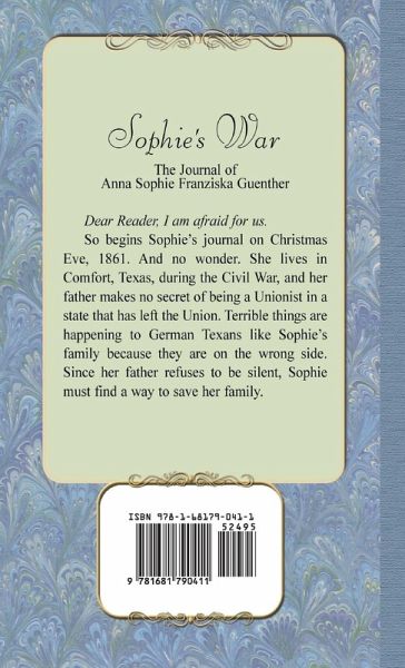 Dear Reader, I am afraid for us. So begins Sophie's journal on Christmas Eve, 1861. And no wonder. She lives in Comfort, Texas, during the Civil War, and her father makes no secret of being a Unionist in a state that has left the Union. Terrible things are happening to German Texans like Sophie's family because they are on the wrong side. Since her father refuses to be silent, Sophie must find a way to save her family.